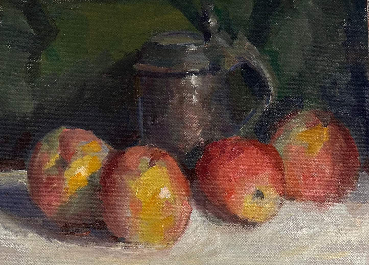 "Apples and Pewter" Oil on Canvas on Panel, 9 x 12 Inches by Susan Grisell