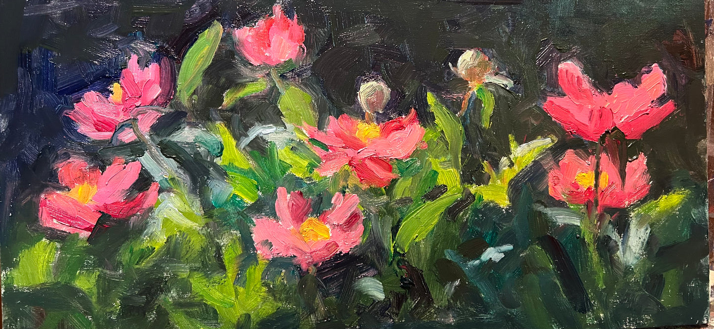 “Peonies, Outdoors”, Oil on Linen on Panel, 10 x 20 Inches by Susan Grisell