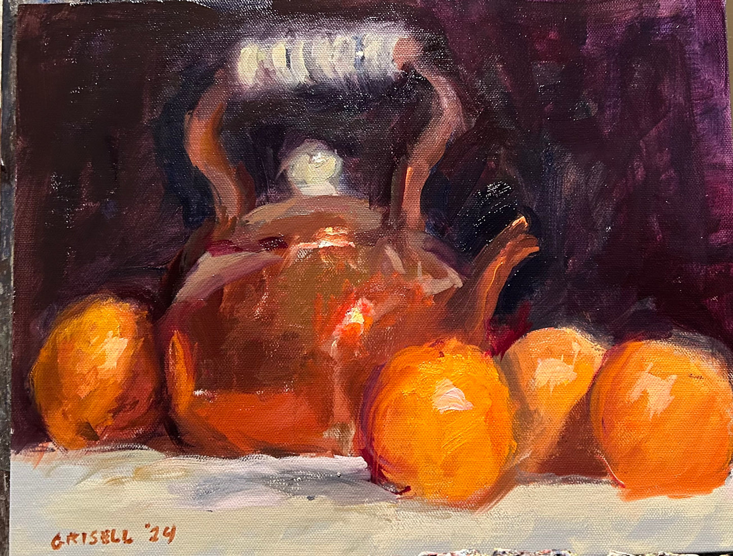 “Teakettle and Oranges”, Oil on Canvas on Panel, 11 x 14 Inches by Susan Grisell
